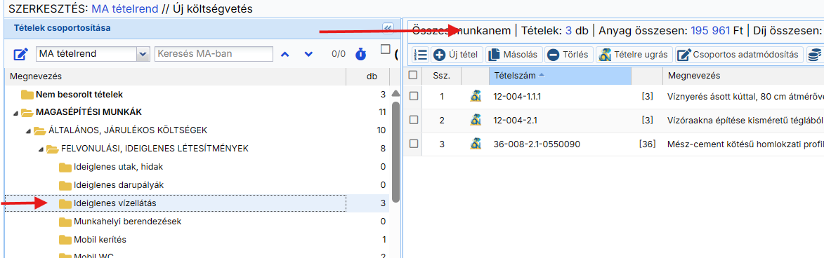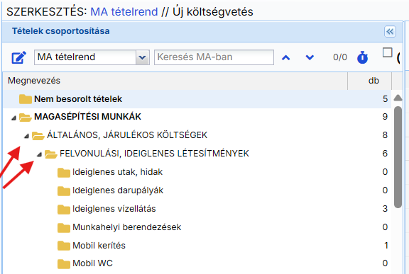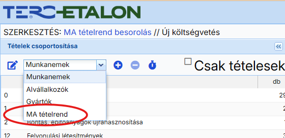 Egy már összeállított költségvetés esetén a felvett tételek eddig is csoportosítottak voltak Munkanemenként, Gyártókként, illetve Alvállalkozói jelölésekként. Ez a csoportosítási lehetőség egészült ki az 'MA tételrend' elemmel.