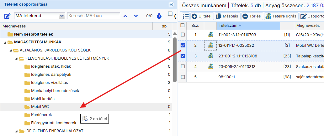 A csoportosítási lista kibontásakor ügyeljünk arra, hogy ha egy listaelemet kiválasztunk - a rendszer automatikusan beszűri a tételeket az adott elemre. Így ha a csoportosítás végrehajtása a cél, akkor mindig a struktúra sorának elején lévó nyílra kattintva nyissuk csak le a szinteket, majd a tétellistában kijelölt (akár több) tételét a 'drag and drop' módszerrel húzzuk át a kivánt végelemre.