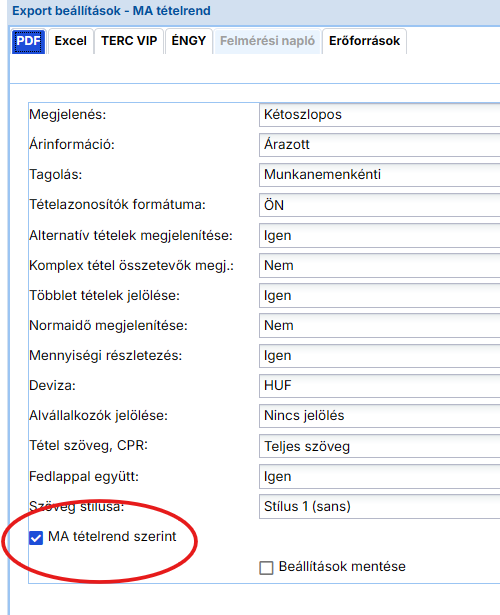 Az MA tételrend szerinti expotálás egyelőre az export ablak alsó részén kapott helyet.