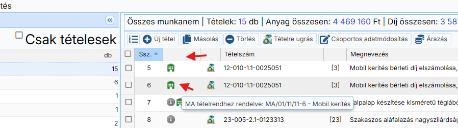 A besorolt tételeket külön ikonnal jelöltük, a jelre húzva az egérkurzort az MA rend szerinti számát is megjeleníthetjük.