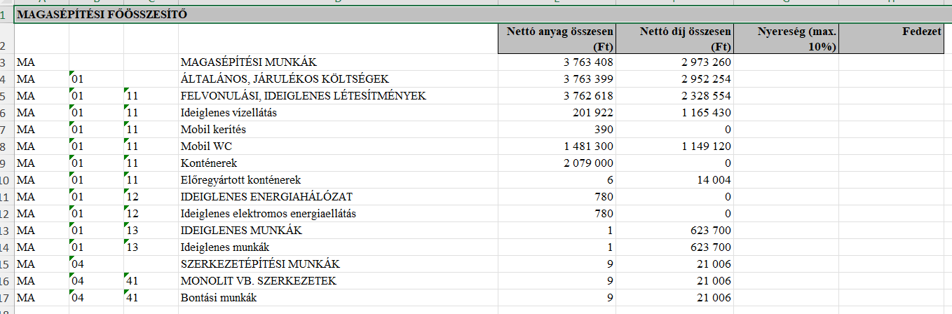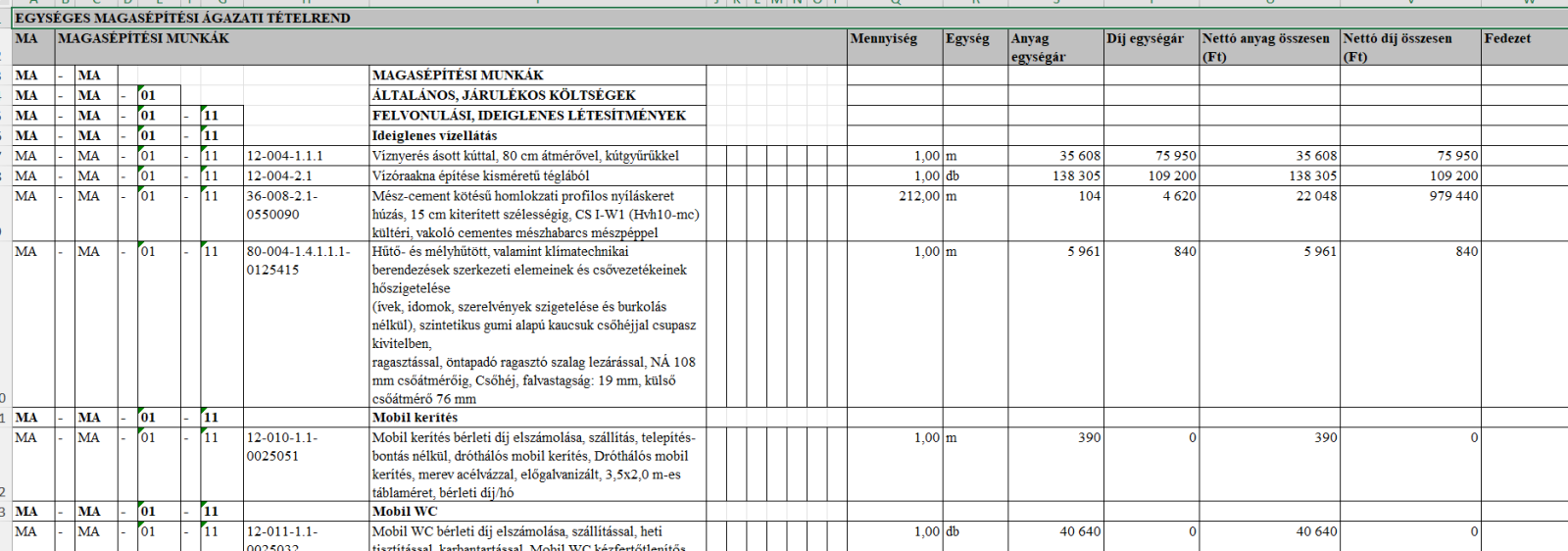Az így elkészített exportokban csak azok a tételrendi sorok és struktúrák fognak megjelenni, amiben taállható a költségvetésben hozzárendelt tétel.