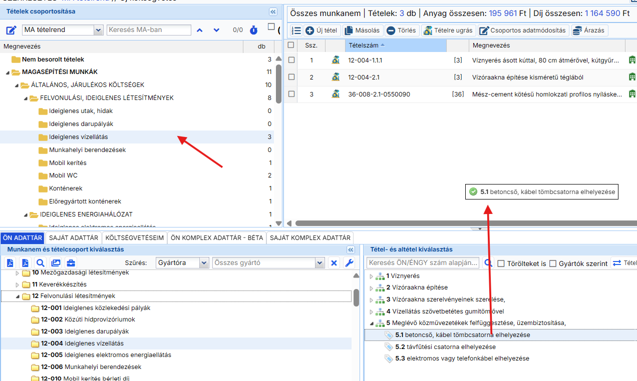 Ha plusz tételt akarunk felvenni a költségvetésbe és már előre tudjuk annak tételrend szerinti helyét, a struktúrában jelöljük azt ki és ezután vegyük fel a kívánt tételt az ÖN adattárból, Saját adattárból vagy akár másik költségvetésből.