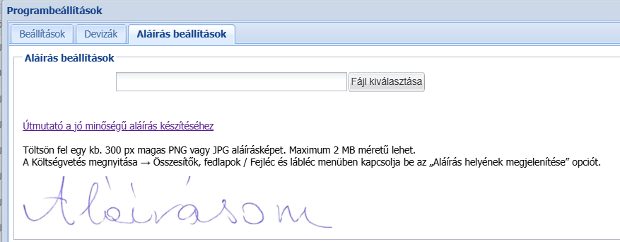 - A programbeállítások ablakban keresse az 'Aláírás beállítások' fület, ahol feltölthet egy kb. 300 pixel magasságú képet. A kép készítéséhez, átméretezéséhez, optimalizálásához az ablakban talál részletes útmutatót.