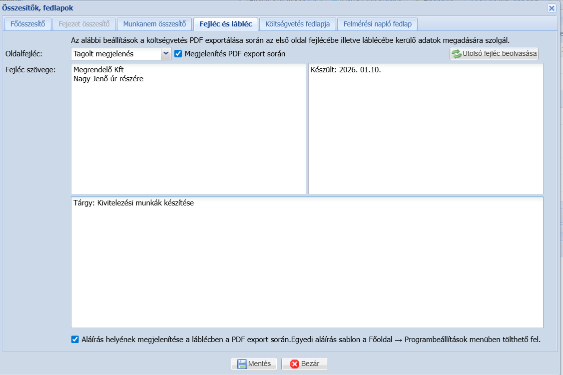 - A költségvetés szerkesztésekor az 'Összesítők, fedlapok' ablakban keresse a 'Fejléc és lábléc' fület és állítsa be az 'Aláírás helyének megjelenítése' kapcsolót.