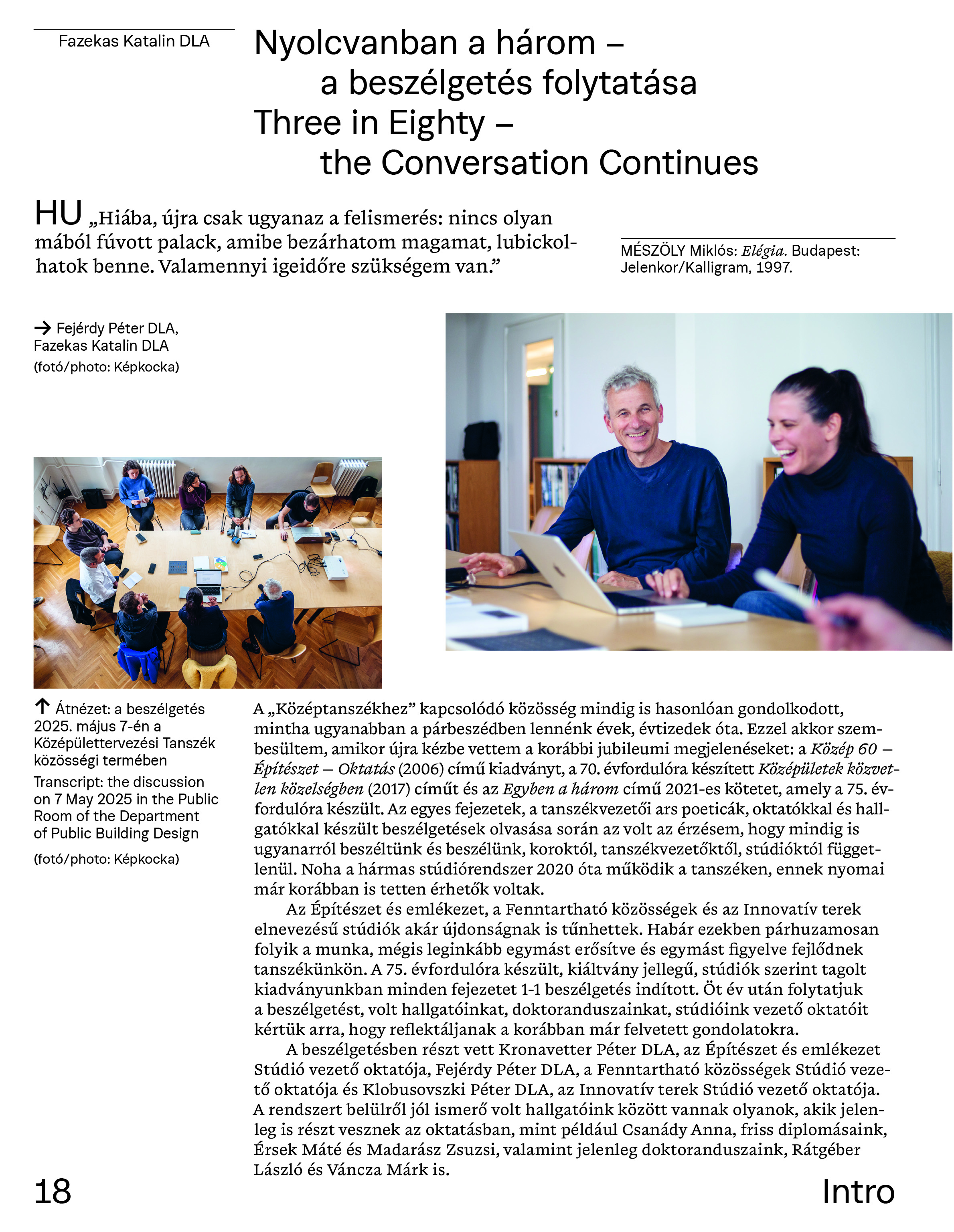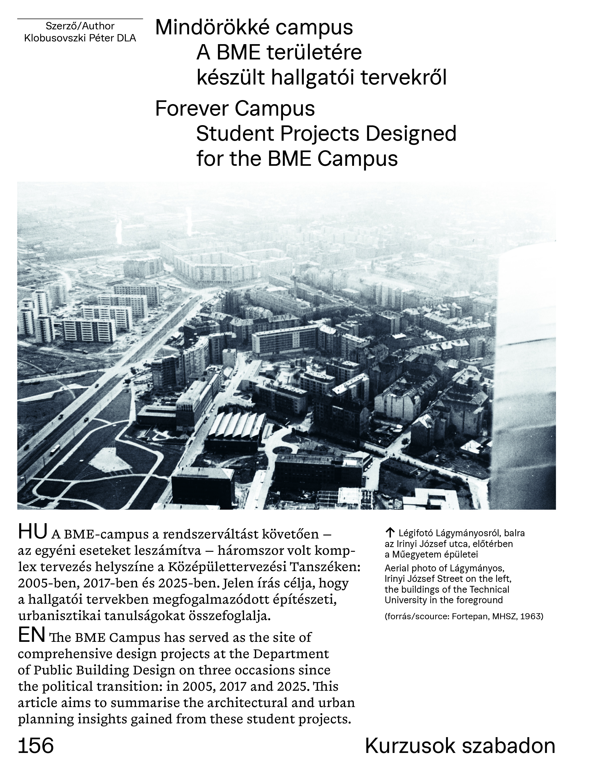 A BME Építészmérnöki Kar Középülettervezési Tanszékének neve immár nyolc évtizede jól ismert fogalom az építészek körében. Könyvünk a 2026-ban 80 esztendeje fennálló, mindenkori mester-tanítvány viszonyok által fejlődő, közösségi karakterű Középülettervezési Tanszék elmúlt öt évére fókuszál.