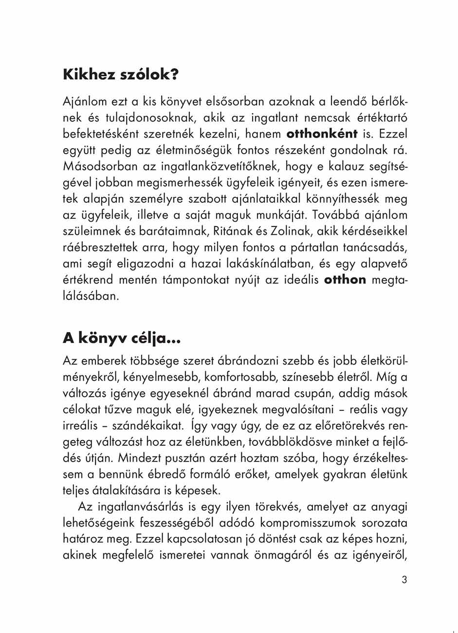 A zsebkönyv méretű kalauz hatékony segítséget kíván nyújtani a megfelelő otthon kiválasztásához. A szerző, Beszeda Zoltán ezekkel a sorokkal vezeti be művét: "Ajánlom ezt a kis könyvet elsősorban azoknak a leendő bérlőknek és tulajdonosoknak, akik az ingatlant nemcsak értéktartó befektetésként szeretnék kezelni, hanem otthonként is. Ezzel együtt pedig az életminőségük fontos részeként gondolnak rá. Másodsorban az ingatlanforgalmazóknak, hogy e kalauz segítségével jobban megismerhessék ügyfeleik igényeit, és ezen ismeretek alapján személyre szabott ajánlataikkal könnyíthessék meg az ügyfeleik, illetve a saját maguk munkáját."