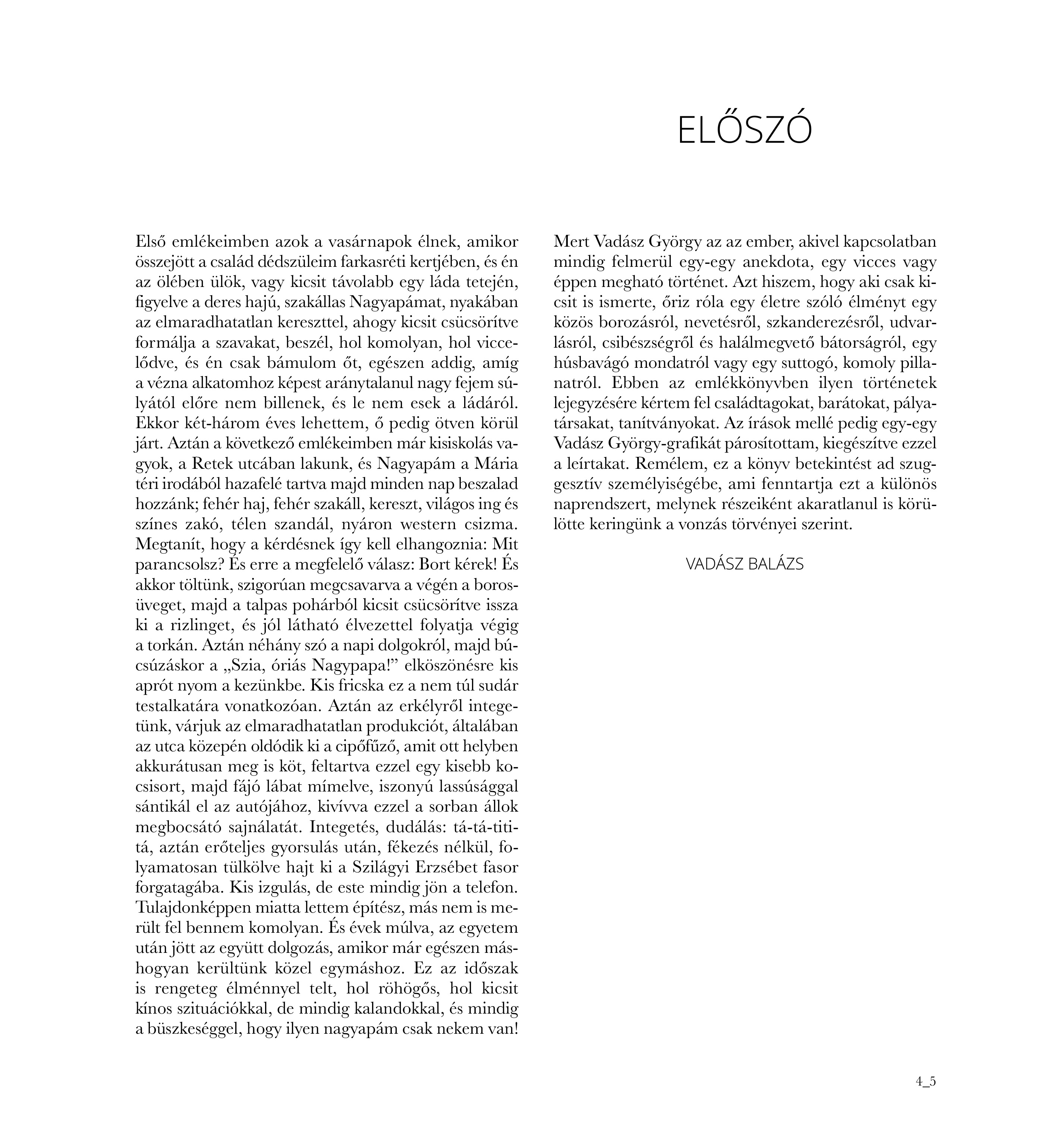„Vadász György az az ember, akivel kapcsolatban mindig felmerül egy-egy anekdota, egy vicces vagy éppen megható történet. Azt hiszem, hogy aki csak kicsit is ismerte, őriz róla egy életre szóló élményt egy közös borozásról, nevetésről, szkanderezésről, udvarlásról, csibészségről és halálmegvető bátorságról, egy húsbavágó mondatról vagy egy suttogó, komoly pillanatról. Ebben az emlékkönyvben ilyen történetek lejegyzésére kértem fel családtagokat, barátokat, pályatársakat, tanítványokat. Az írások mellé pedig egy-egy Vadász György-grafikát párosítottam, kiegészítve ezzel a leírtakat. Remélem, ez a könyv betekintést ad szuggesztív személyiségébe, ami fenntartja ezt a különös naprendszert, melynek részeiként akaratlanul is körülötte keringünk a vonzás törvényei szerint.” Vadász Balázs
