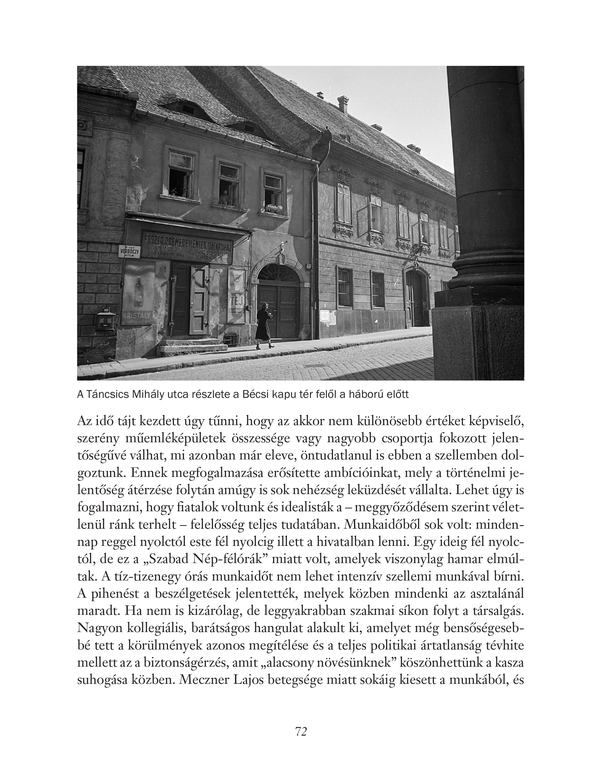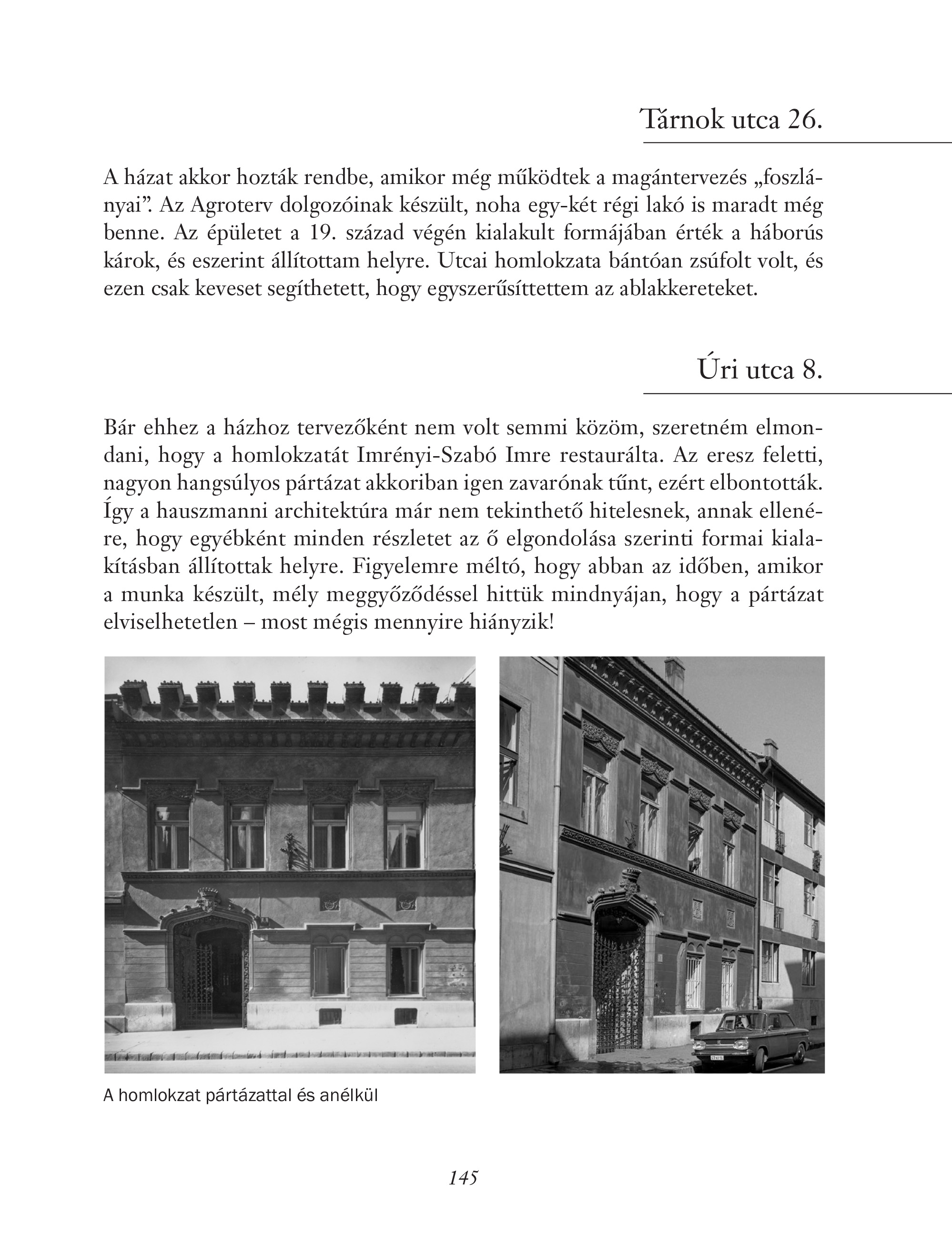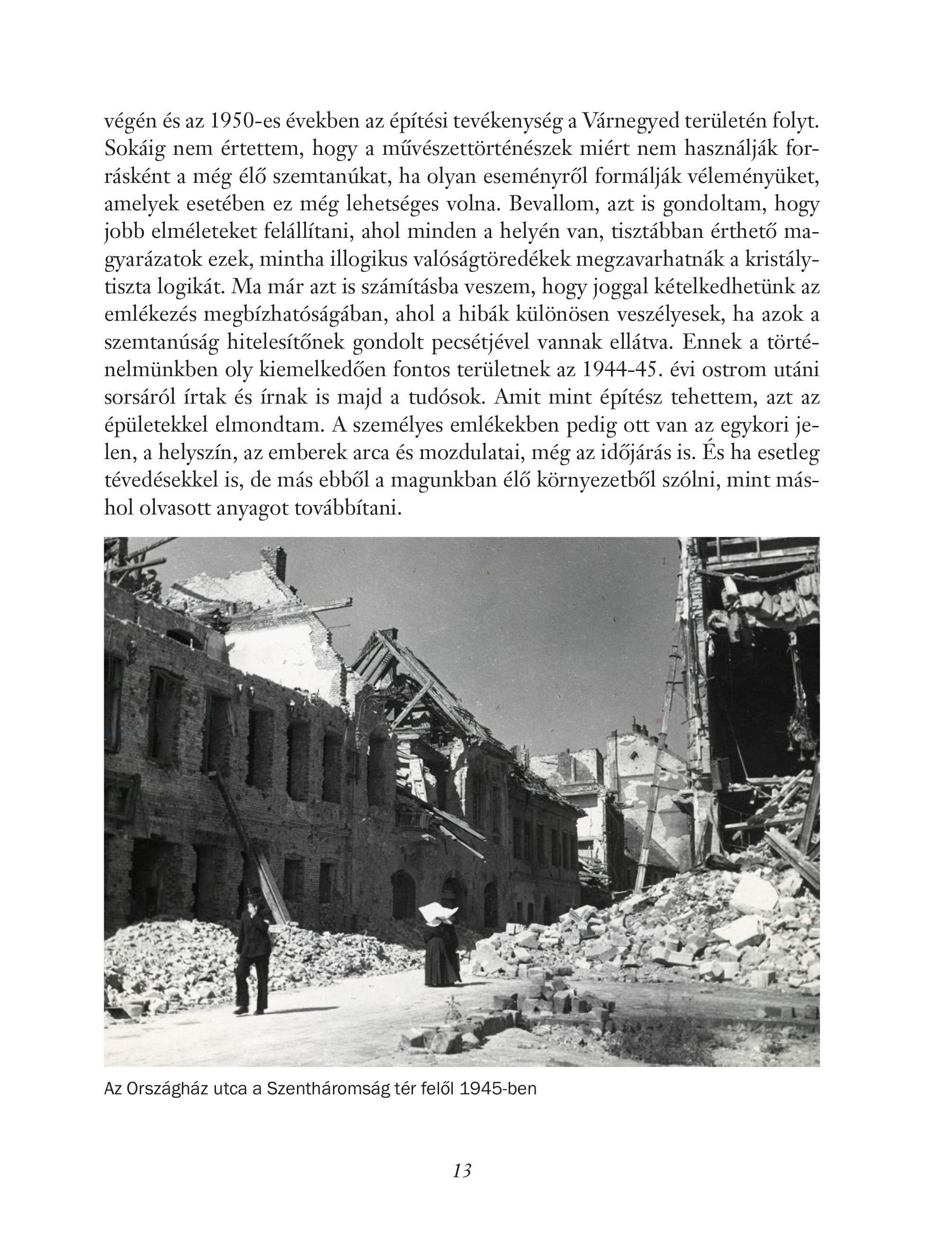 Dragonits Tamás építészmérnök sokrétű tervezői munkásságából a budai Várnegyed háború utáni helyreállítását eleveníti fel könyvében. A személyes emlékekkel megidézett, több évtizedet átfogó történet éppúgy szól a munkában résztvevő szakemberekről, a műemlékvédelem változó elveiről, mint a Várnegyed lakóiról, legendás helyeiről, épületeiről vagy magáról a korról. A szerző lebilincselő, nemritkán humorral átszőtt érdekes történetei kellemes olvasmánnyá formálják ezt az építészettörténeti írást.