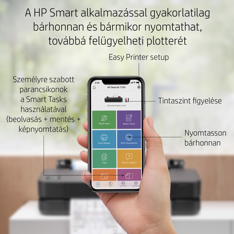 HP DesignJet T650 24 hüvelykes nyomtató, nyomtatóállvány, automatikus lapadagoló, tekercsborítás, nyomtatófej, induló tintapatronok, orsó, gyorskalauz, üzembehelyezési útmutató, tápkábel |